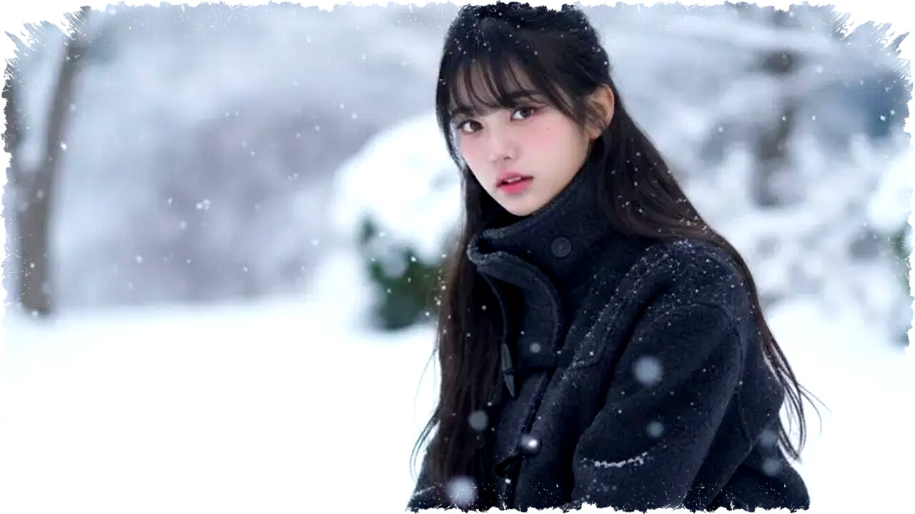 "Jadikan foto ini bernuansa musim dingin dengan salju tipis beterbangan, subjek menoleh ke samping dengan ekspresi tenang, tatapan mata tidak kosong, pencahayaan sinematik natural, warna dingin seimbang, detail wajah tetap asli, tampilan realistis seperti foto nyata."