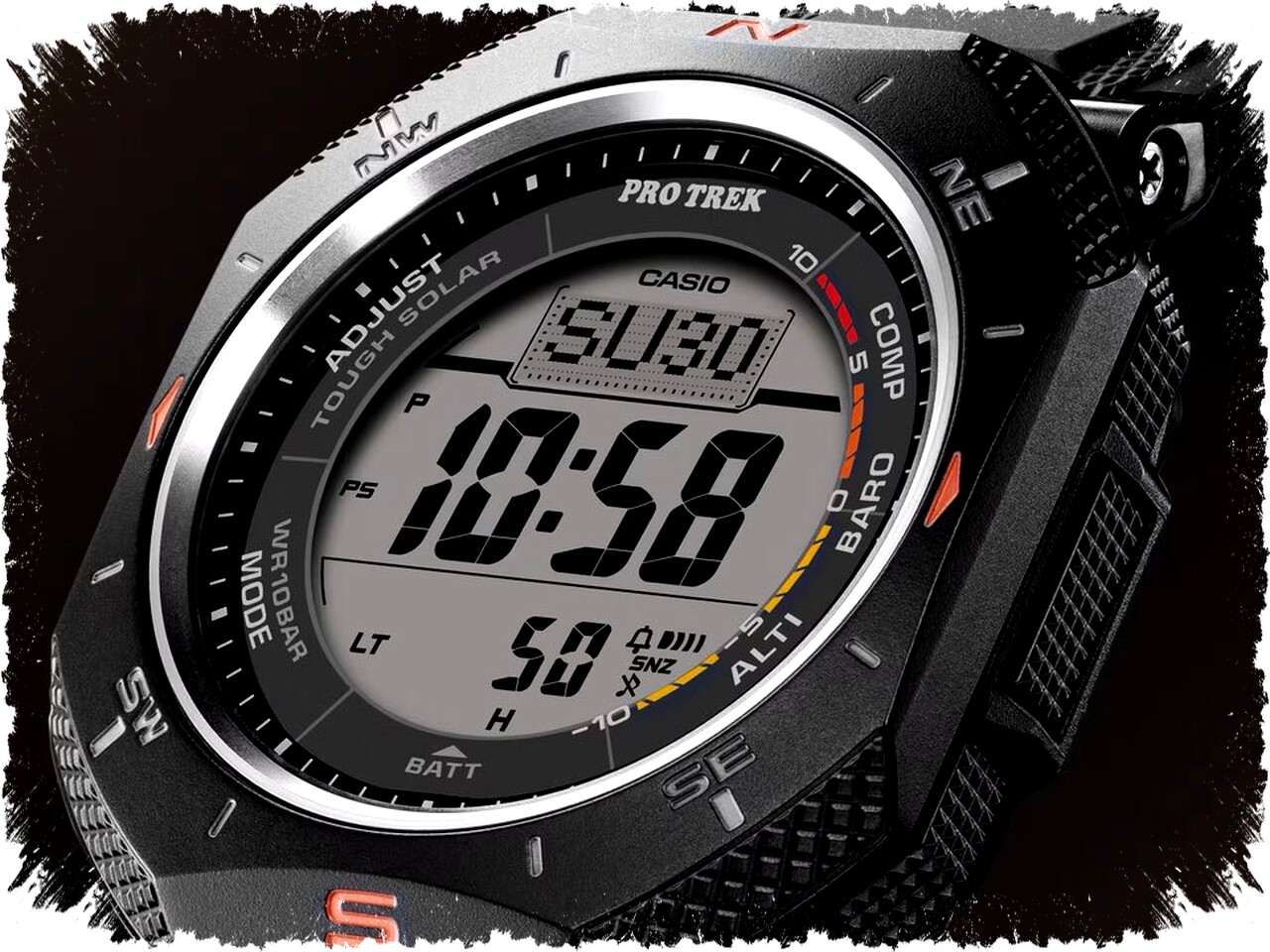 Salah satu nilai unggul dari Pro Trek PRG-69 adalah layar Duplex LCD berlapis ganda yang inovatif. Lapisan atas menampilkan grafik kompas berwarna yang dinamis, sementara layar bagian bawah memperlihatkan waktu dan informasi pendukung lainnya dengan jelas. Tersedia juga sub-layar dot-matrix kecil di bagian atas yang menyajikan data penting seperti hari, tanggal, dan tren tekanan barometrik.