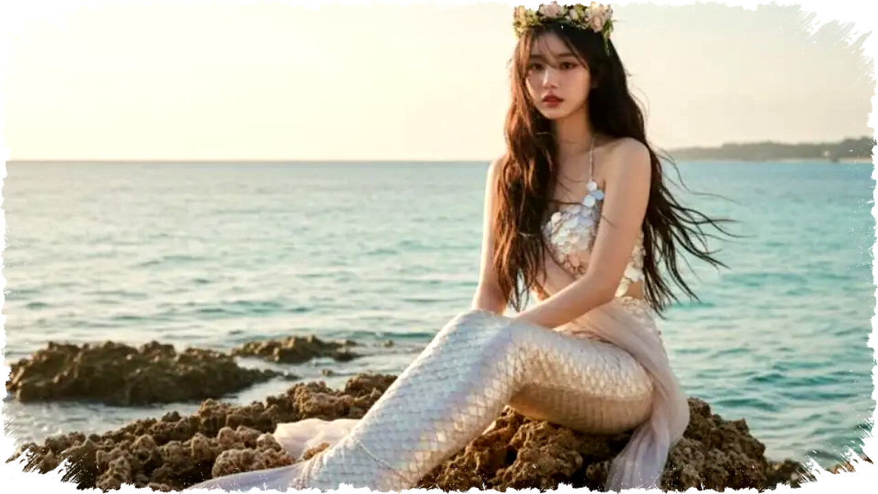 Tambahkan ekor warna mutiara dan posisi duduk santai di batu karang tepi laut. Rambut basah tertiup angin, tatapan mata penuh emosi, serta pencahayaan alami di pagi hari untuk kesan estetik. -