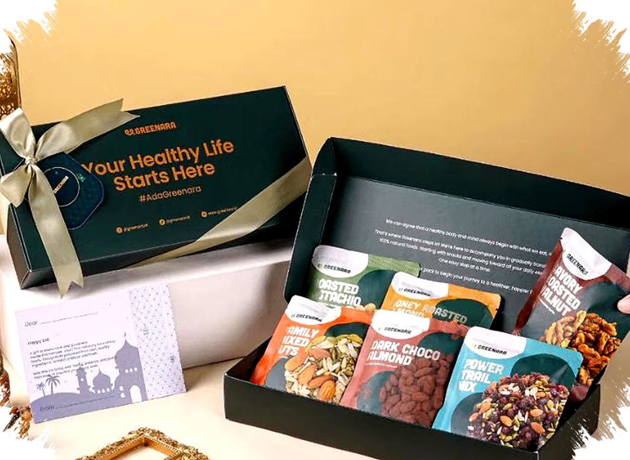 Greenara menawarkan paket snack sehat bebas bahan pengawet dan pewarna buatan, seperti kacang pistachio dan dark chocolate almond. Dengan harga Rp104 ribuan, pilihannya terjangkau dan tetap memberi nilai tambah karena lebih ramah untuk konsumsi sehari-hari.