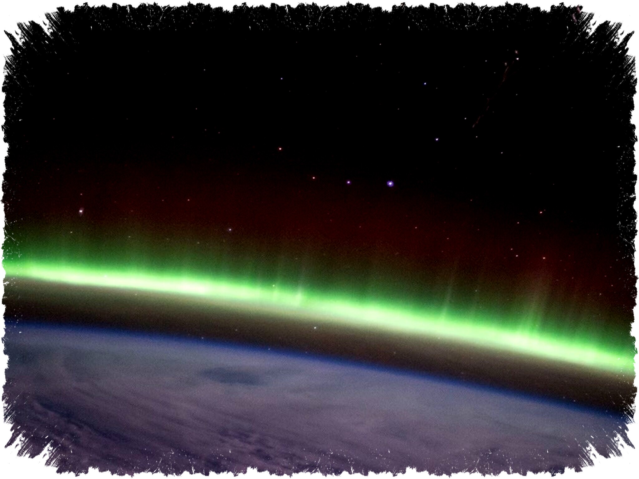 - Auroral arcs tampil sebagai garis tipis cahaya hijau yang terlihat dari luar angkasa.